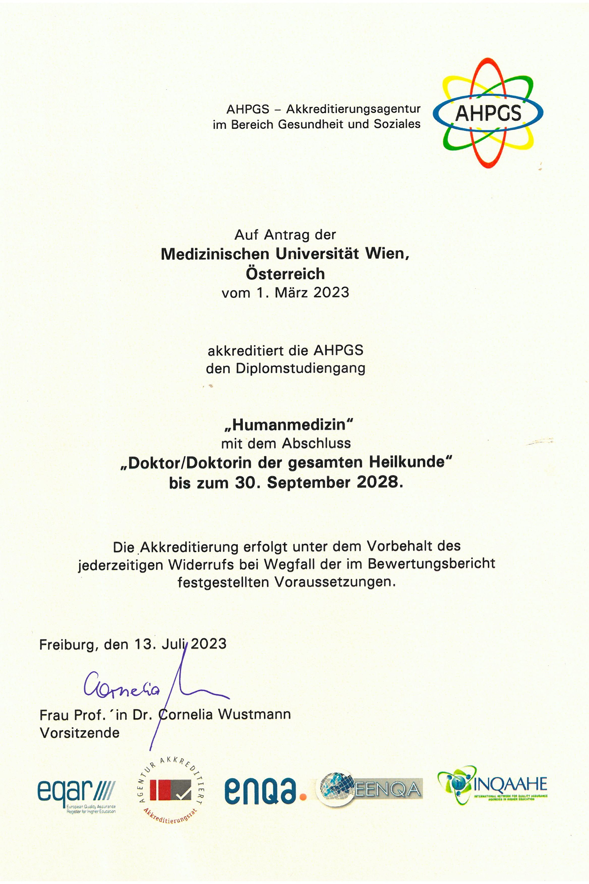 The accreditation procedure was positively completed by the AHPGS (Accreditation Agency in Health and Social Affairs) on the basis of the "European Standard and Guidelines for Quality Assurance in the European Higher Education Area (ESG)" and taking into account the "Basic Medical Education WFME Global Standards for Quality Improvement" defined by the World Federation for Medical Education (WFME) without any conditions.
