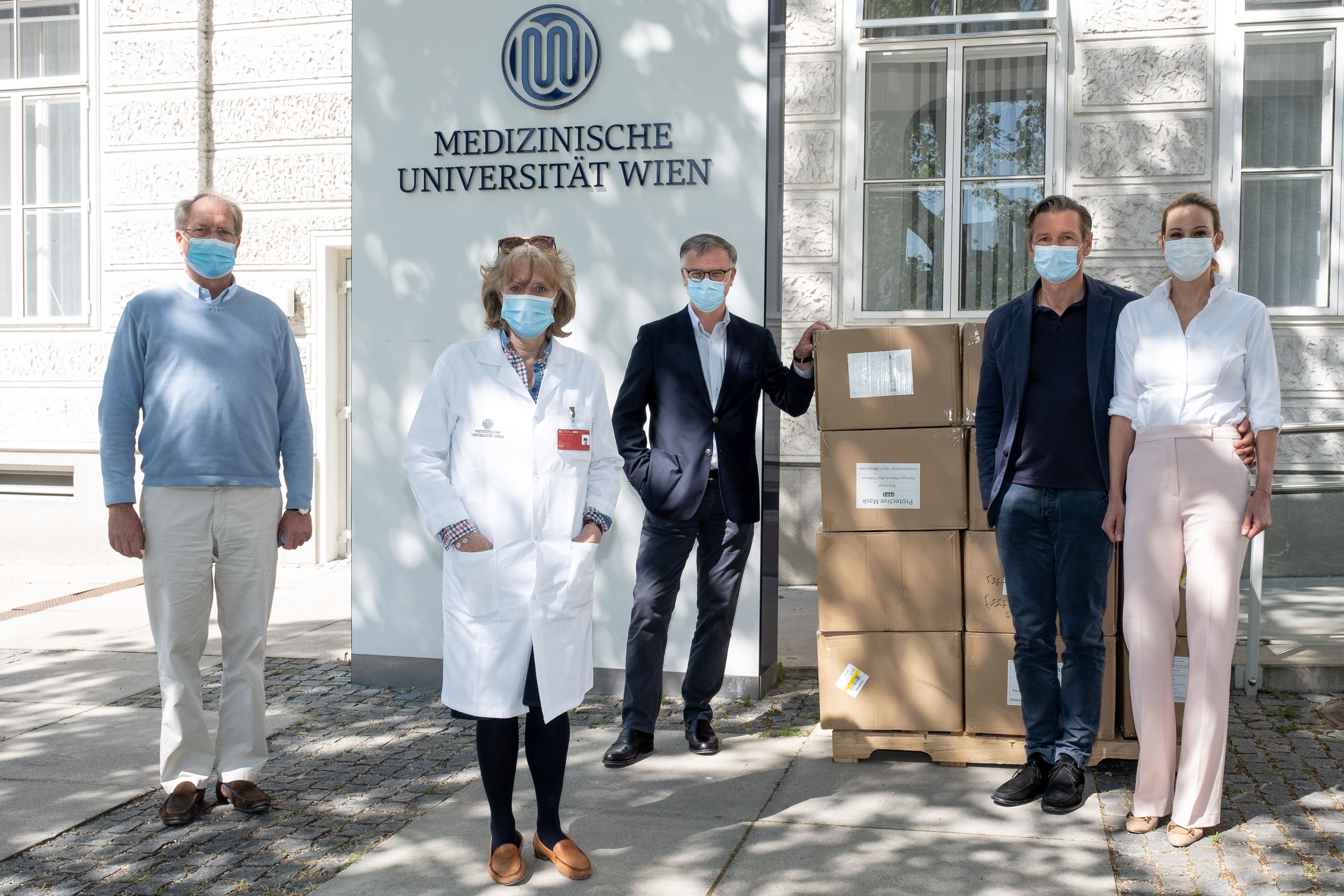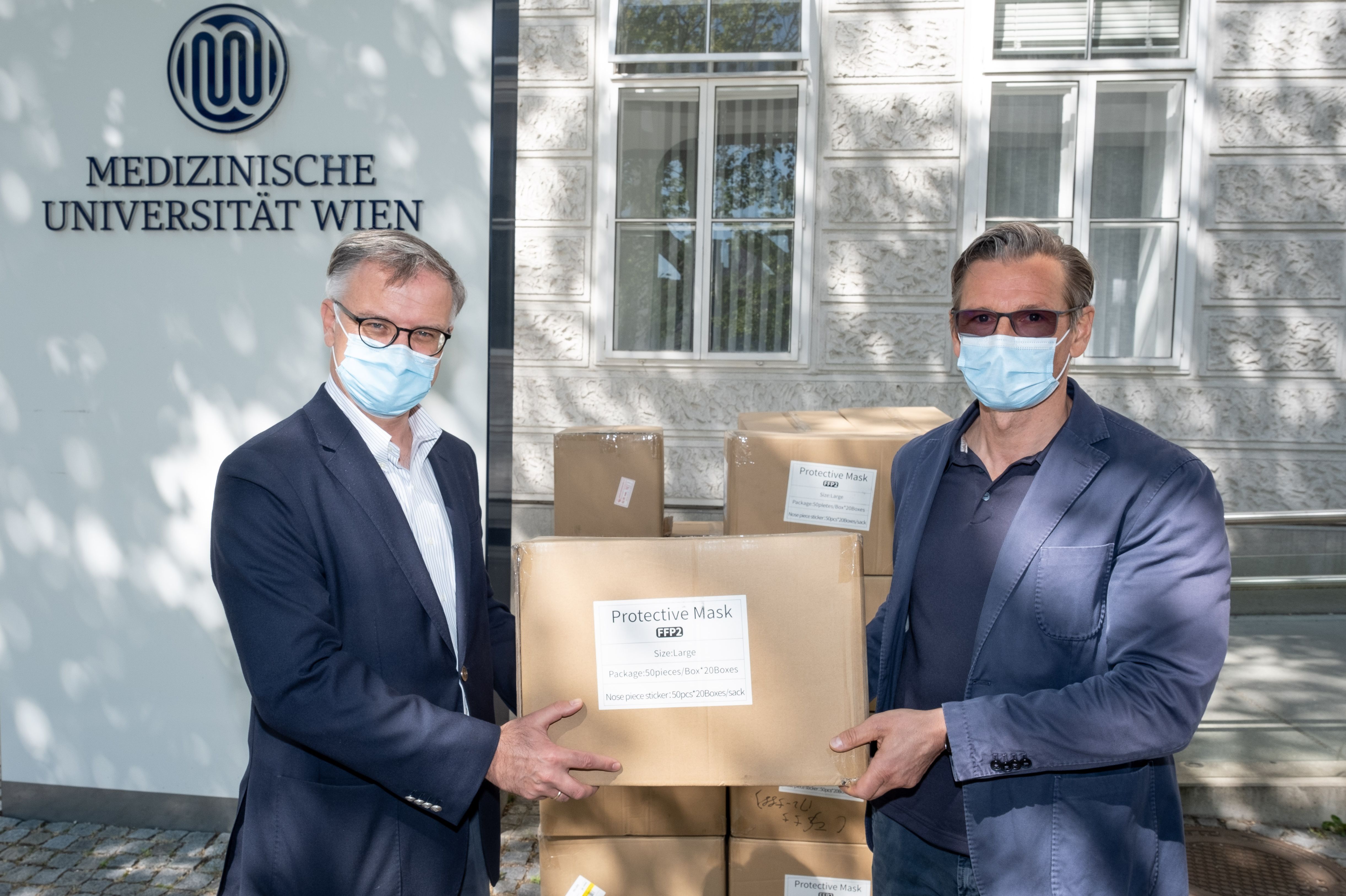 (Vienna, 24 April 2020) The Austrian company C-Quadrat-Investment AG has donated a total of 230,000 face masks to MedUni Vienna. Company-founder and Deutsche Bank AG Board Member Alexander Schütz personally delivered the consignment of surgical face masks and 30,000 FFP2 masks to MedUni Vienna's Rectorate Building, where they were received by Rector Markus Müller and Vice Rector for Clinical Matters, Oswald Wagner.
