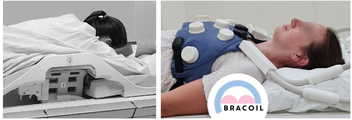 Bei Standard-Brustspulen liegt die Patientin mit dem Gesicht nach unten auf der Patientenliege und lässt ihre Brüste in Mulden in der Spule hängen. Oft sind diese Mulden aber für kleine Brüste zu groß und für sehr große Brüste zu klein, außerdem ist die Bauchlage für viele Patientinnen unangenehm. Daher haben wir eine Weste ("BraCoil") entwickelt, mit der Brustkrebsuntersuchungen am Rücken liegend durchgeführt werden können.