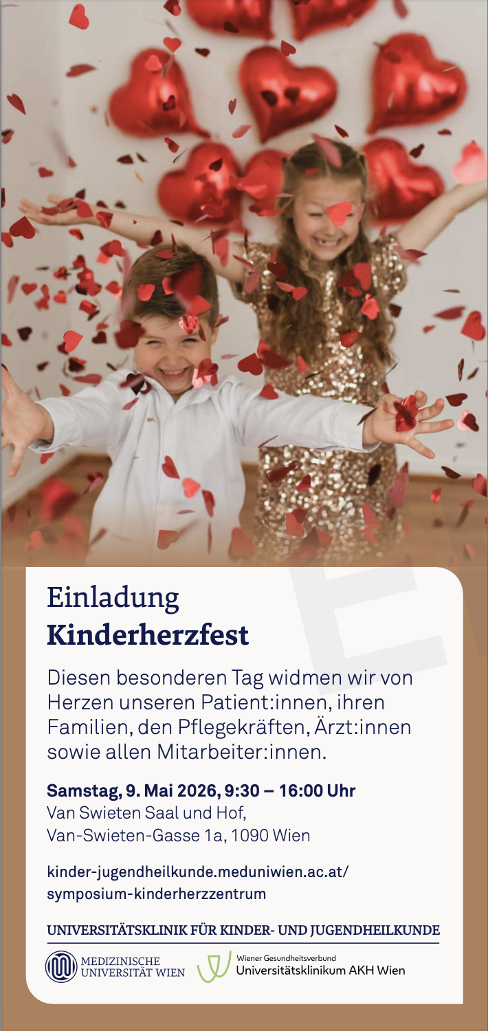 Das Kinderherzzentrum der Universitätsklinik für Kinder- und Jugendheilkunde der MedUni Wien und des AKH Wien veranstaltet am 8. und 9. Mai 2026 ein Symposium. Ziel der Veranstaltung ist es, nicht nur ein aktuelles Update zu den Themen Lungenhochdruck, Herzinsuffizienz sowie Herz- und Lungentransplantation bei Kindern und Jugendlichen zu geben, sondern vor allem gemeinsam mit nationalen und internationalen Expert:innen einen Blick in die Zukunft zu wagen. Unter dem Leitgedanken „Advancing Patient Care“ stehen innovative Perspektiven für die Versorgung von Kindern mit angeborenen und erworbenen Herz-Kreislauf-Erkrankungen im Fokus. Eingebettet in das wissenschaftliche Programm am 8. Mai (8:00 bis 12:00 Uhr, Großer Hörsaal, Universitätszahnklinik) findet um 13:00 Uhr die Antrittsvorlesung von Georg Hansmann, Professor für Pädiatrische Kardiologie und neuer Leiter der Klinischen Abteilung für Pädiatrische Kardiologie, statt (HS3, Hörsaalzentrum).