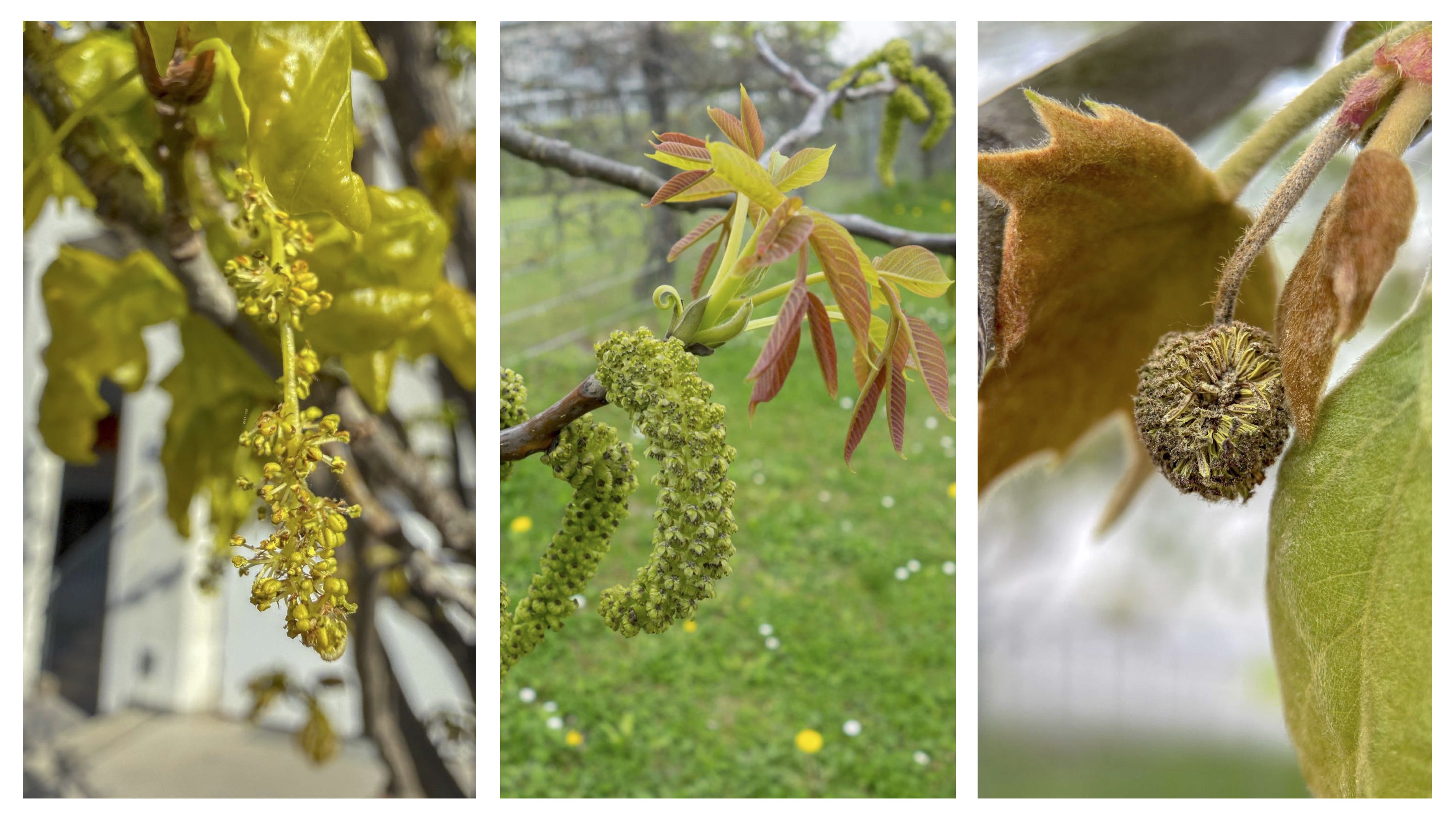 Abbildung: Nebenallergenen kommt nun zunehmende Bedeutung zu: männlicher, blühender Blühstand der Eiche (links), blühende Kätzchen der Walnuss (Mitte) und männlicher, blühender Blühstand der Platane (rechts).