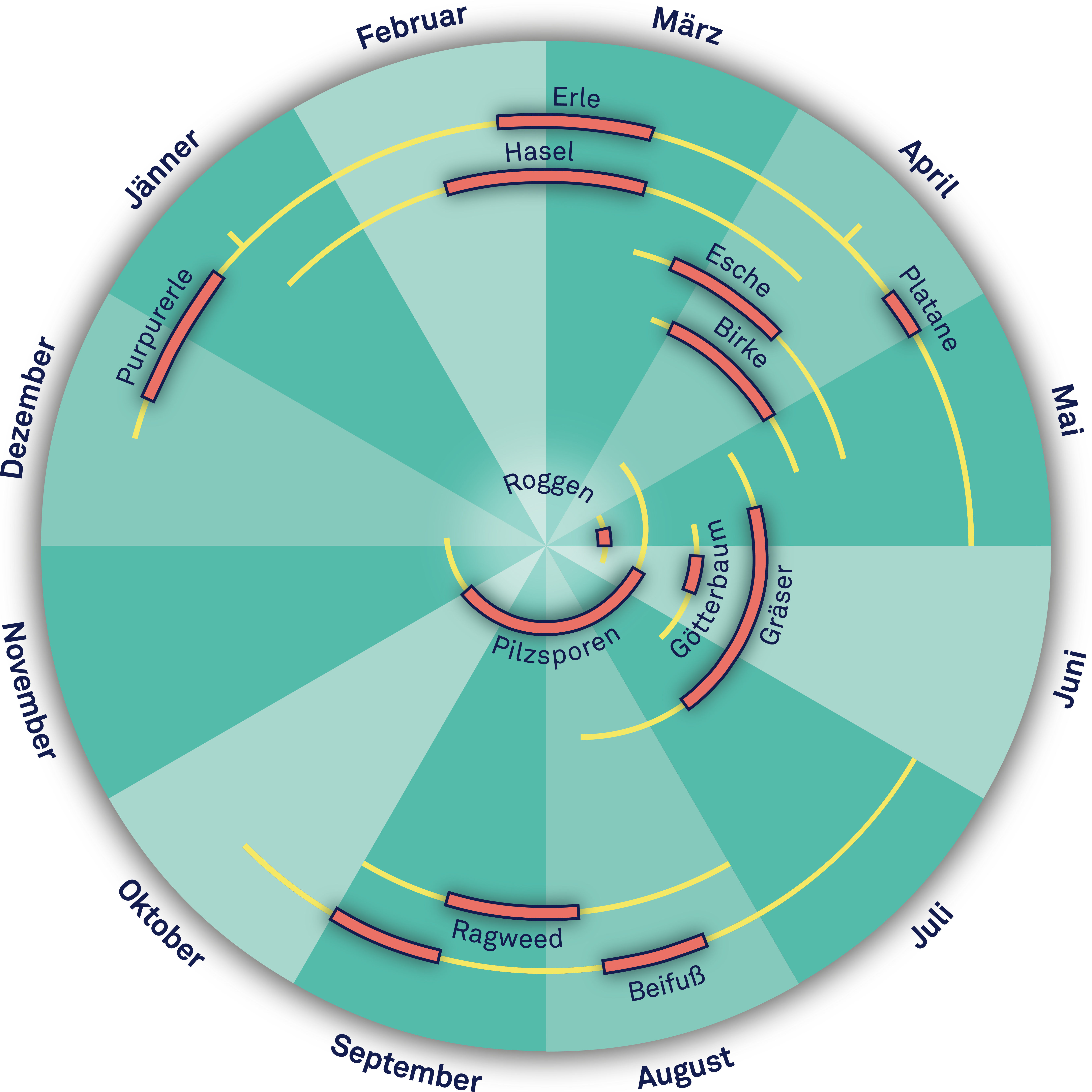 Hier sind die üblichen Pollenflugzeiten (gelb) zusammen mit der Zeit der durchschnittlichen Vollblüte (rot) der wichtigsten Aeroallergene über ein Kalenderjahr visualisiert.