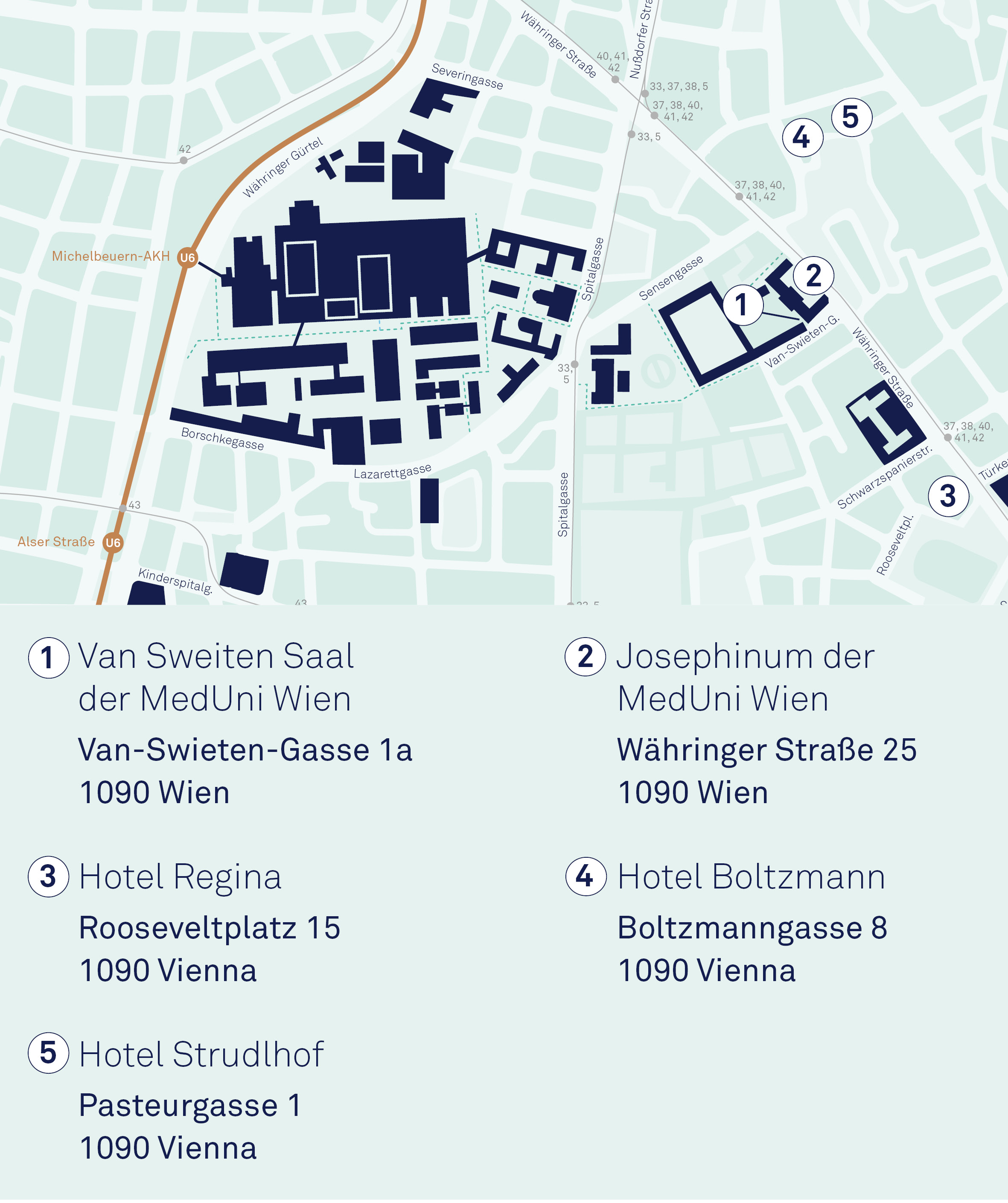 Damit Sie stressfrei zu unserem Event an der MedUni Wien gelangen, finden Sie hier alle wichtigen Informationen zur Anreise mit öffentlichen Verkehrsmitteln, dem Auto oder dem Fahrrad.