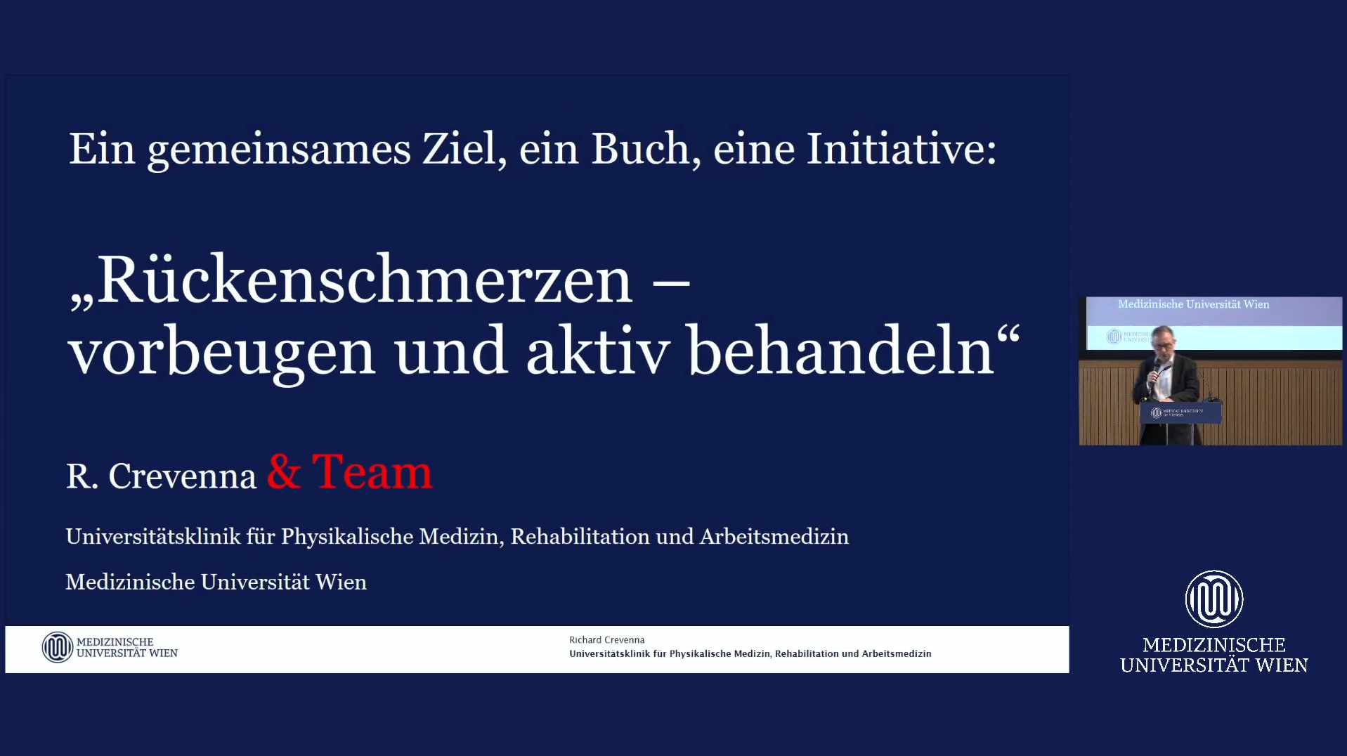 Es handelt sich um ein höchst interdisziplinäres und multiprofessionelles Thema. Diesem Ansatz folgend wird das Thema Rückenschmerzen in Form von wissenschaftlichen Vorträgen, Workshops und Podiumsdiskussionen betrachtet. Expertinnen und Experten der Physikalischen Medizin und Rehabilitation, des Arbeitsinspektorates, der Allgemeinmedizin, Orthopädie, Arbeits- und Organisationsmedizin, Interdisziplinären Schmerzmedizin und Geriatrie sowie Psychologie, Psychotherapie, Physiotherapie und Sportwissenschaft beleuchten das Thema.