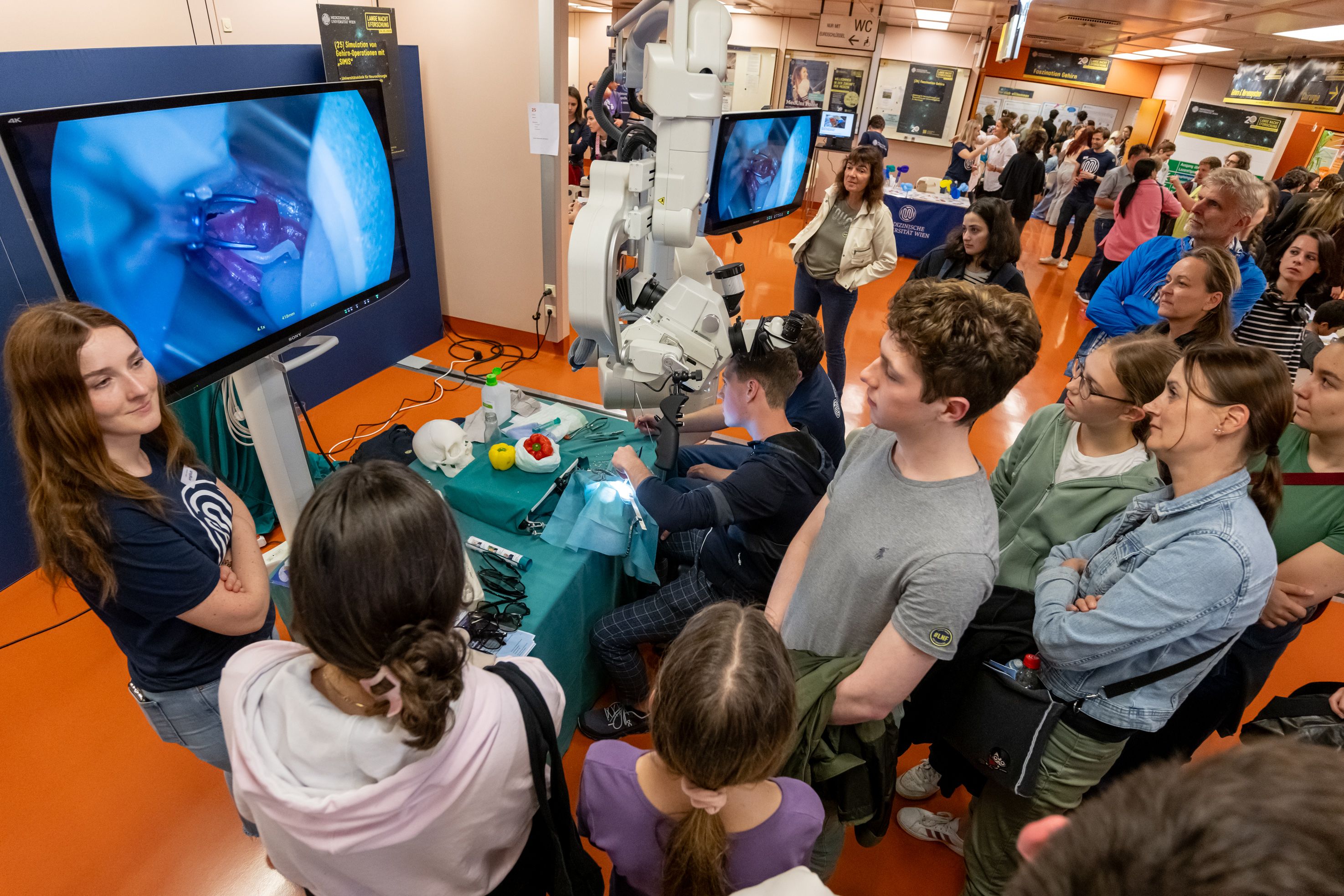 An 15 Standorten bieten die MedUni Wien und ihre Partnerinstitutionen an mehr als 200 Stationen Einblicke in aktuelle Entwicklungen und Innovationen der modernen Medizin. Das Hörsaalzentrum der MedUni Wien im AKH Wien ist dabei ein Sammelpunkt besonders vieler Vorführungen, Präsentationen und Mitmach-Stationen. Bereits um 16 Uhr eröffnet Bestsellerautor Thomas Brezina den Abend mit ausgewählten Informationen aus seinem neuen Familienbuch „Was dein Körper sagen würde, wenn er sprechen könnte“, das in Kooperation mit der MedUni Wien entstanden ist. Besondere Highlights sind drei Live-Operationen aus der Herz-, Transplantations- und Neurochirurgie. Besucher:innen können live mitverfolgen, wie Herzchirurg:innen ein Aneurysma der Hauptschlagader operieren werden (Beginn 19 Uhr), wie Neurochirurg:innen ein Hirnaneurysma mittels mikrochirurgischem Clipping versorgen (Beginn 19:30 Uhr) und wie eine Nierentransplantation mithilfe eines OP-Roboters durchgeführt wird (Beginn 20 Uhr). Damit eröffnet sich dem Publikum ein Einblick in drei hochspezialisierte Bereiche der Spitzenmedizin direkt aus dem Operationssaal. Wer sich selbst als Chirurg:in ausprobieren möchte, hat an den verschiedenen Hands-on Stationen und in Workshops viele Gelegenheiten dazu: Am Da-Vinci-OP-Roboter-Simulator können Besucher:innen selbst Operationen steuern, chirurgische Techniken wie Nähen, Knüpfen, Laparoskopie und Elektrochirurgie ausprobieren.