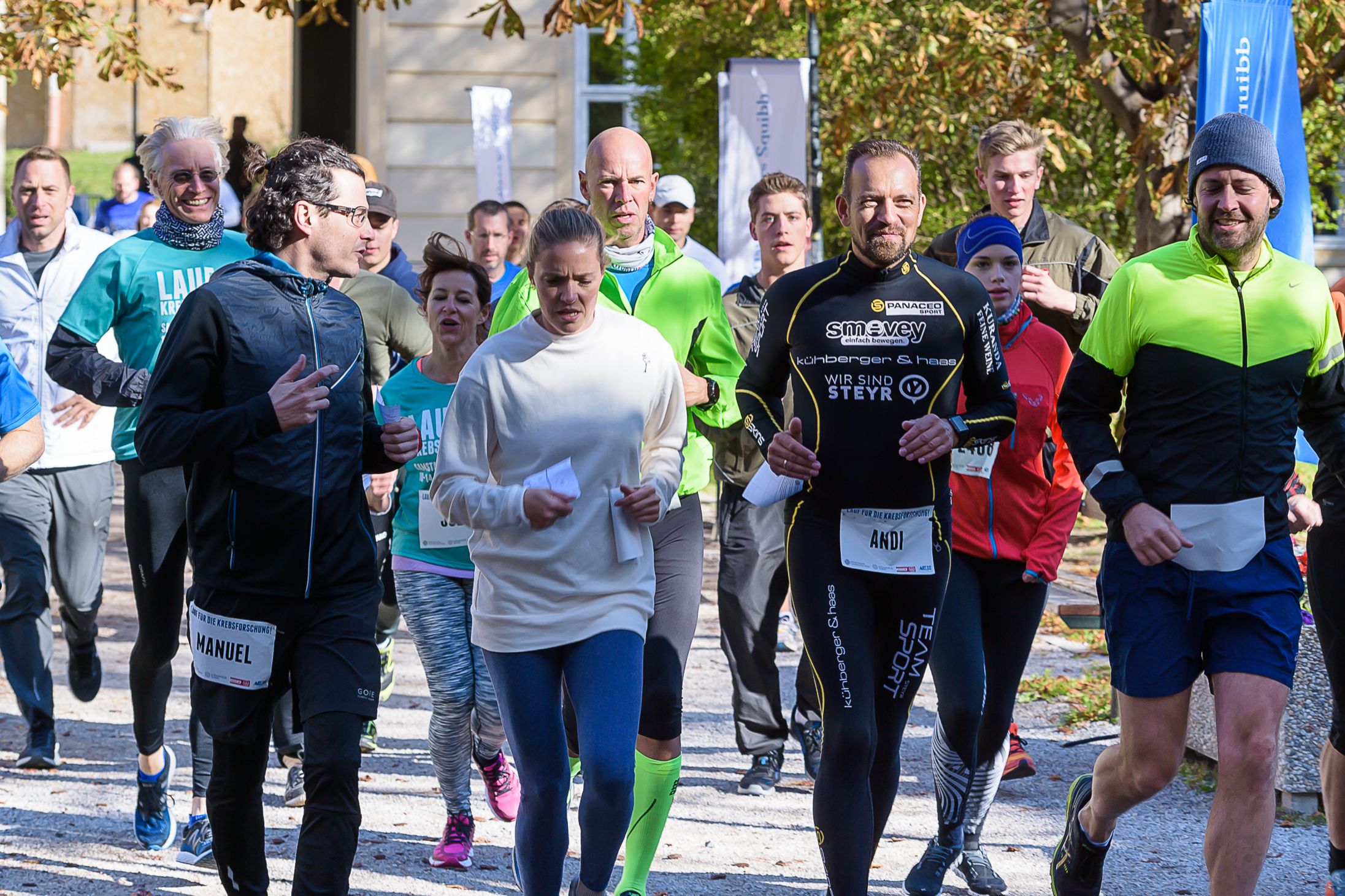Krebsforschungslauf 2017 bei prächtigem Laufwetter und mit den SchauspielerInnen Manuel Rubey (links), Julia Cencig und Patricia Aulitzky (Mitte) sowie Extremläufer Andi Gindlhumer (im schwarzen Dress).