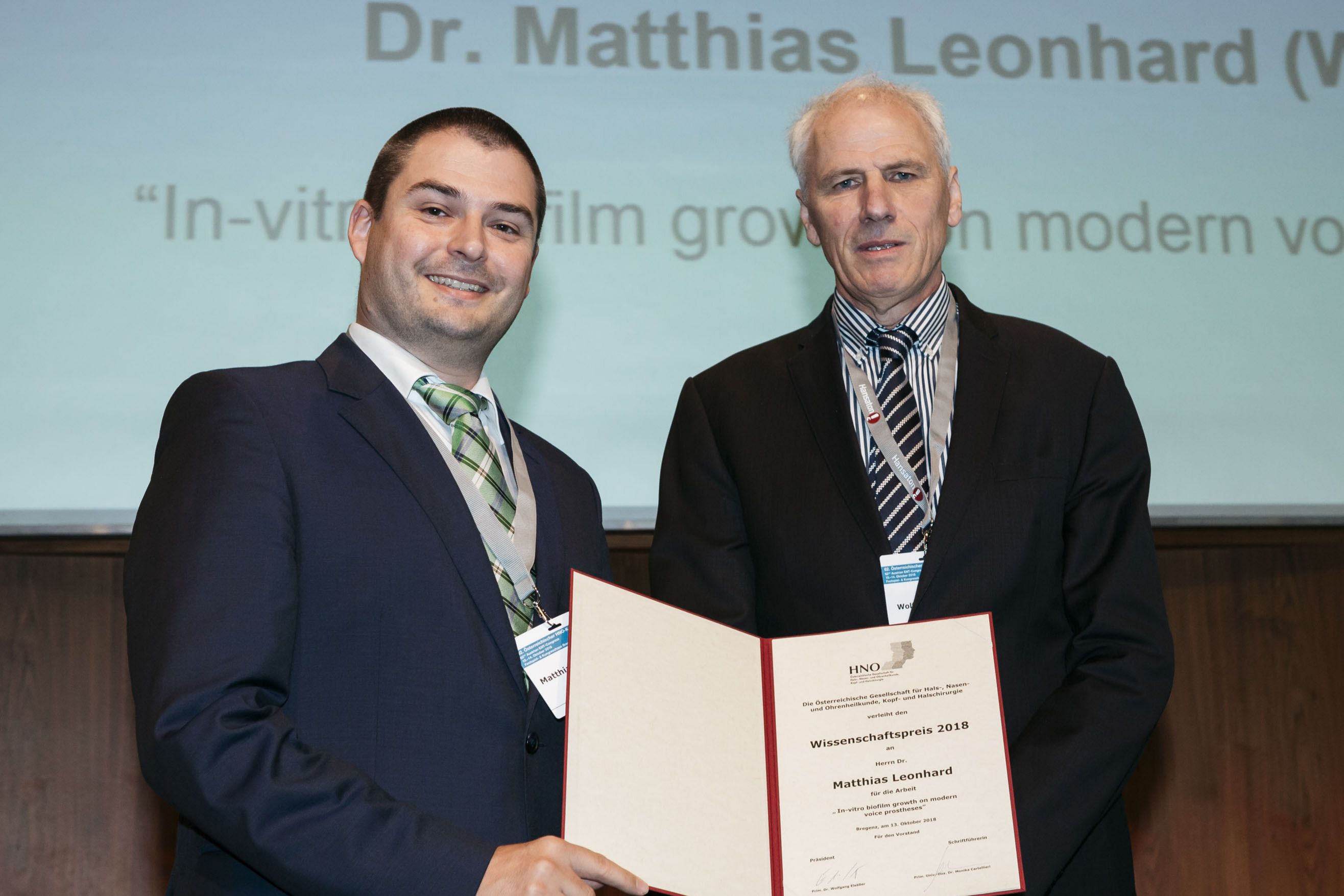 Matthias Leonhard wurde am Österreichischen HNO-Kongress in Bregenz für seine Studie zu Biofilmen auf Stimmprothesen ausgezeichnet. Stimmprothesen sind kleine Ventilsysteme aus Silikon, die nach Entfernung des Kehlkopfes (Laryngektomie) eine Stimmrehabilitation ermöglichen. Sie müssen jedoch im Durchschnitt alle 2-4 Monate ambulant gewechselt werden, da sie von Bakterien und Pilzen in Form von Biofilmen überwuchert werden. Die Studie präsentiert ein neues in-vitro-Biofilmmodell, das die mikrobielle Mischbesiedelung von Silikon simuliert und für zukünftige Prothesenentwicklungen zum Vergleich neuer biofilm-hemmender Technologien genützt werden kann.