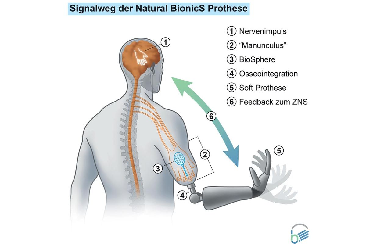 Der Impuls zur Bewegung der Prothese kommt vom Gehirn bzw. dem zentralen Nervensystem (1). Die im Stumpf verbliebenen Nerven enthalten ein neuronales Abbild der gesamten amputierten Extremität – den "Manunculus" (2). Das voll implantierte Biosphere-System (3) im Stumpf übersetzt die Signale in elektronische Impulse. Über einen osseointegrierten Anschluss (4) werden die elektronischen Impulse zur Steuerung der Prothese weitergeleitet. Eine weiche prothetische Hand nach dem "Soft Robotics" Prinzip (5) ermöglicht eine natürliche, intuitive Interaktion mit der Umwelt. Sensoren in der robotischen Hand leiten elektrische Signale in ein Dermis-Transplantat auf dem BioSphere System zurück und werden so als Feedback direkt ins zentrale Nervensystem geleitet (6). Die/Der PatientIn empfindet die Prothese dadurch als natürlichen Teil des Körpers.