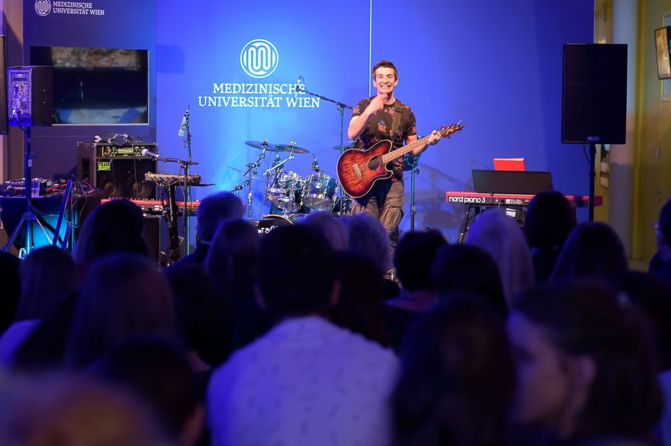 Den lockeren Abschluss des Tags markierte die MedUni-Party für alle MitarbeiterInnen, Studierenden, AbsolventInnen und Freunde der MedUni Wien in Kooperation mit ÖH Med Wien: Live-Bands, DJs, Cocktails, Porträtzeichnungen, Darts- und Gewinnspielen und mehr. Als besonderes Special präsentierte MedUni-Wien-Absolvent, Kinderchirurg und Kabarettist Omar Sarsam Ausschnitte aus seinem aktuellen Kabarettprogramm „Herzalarm“ – mit eingebauter Fun-Garantie auf hohem wissenschaftlichen Niveau.